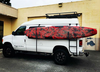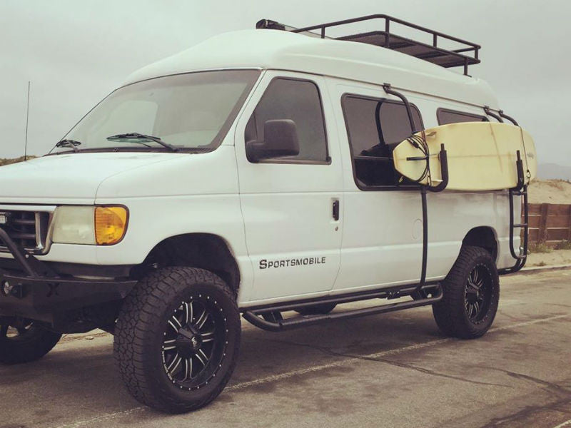 Storage is at a premium on van builds. Aluminess solves this problem with our all-aluminum surf and paddle board carrier. Mount your paddle or surf board using one of our surf poles, driver-side ladder and a pair of surf hooks.